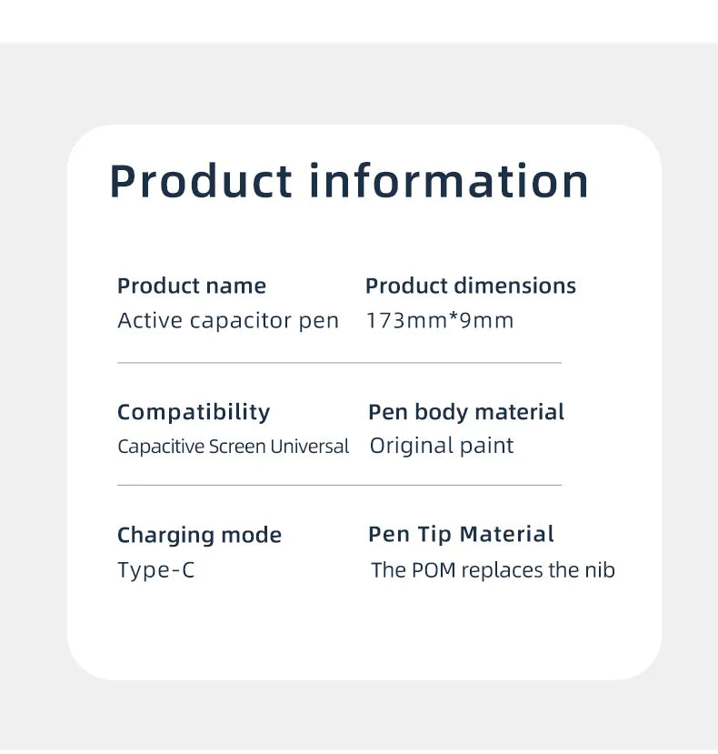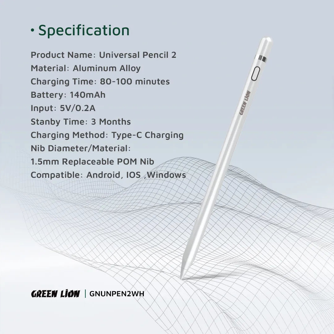 صُمم هذا القلم ليمنحك حركة سلسة وسهلة على شاشة جهازك، مما يجعله مثاليًا للكتابة أو الرسم بدقة. يتميز برأس متين مصنوع من سبيكة ألومنيوم عالية الجودة ليدوم طويلًا ويمنحك شعورًا بالراحة. يتميز القلم بفترة استعداد رائعة تصل إلى 3 أشهر، ما يجعله جاهزًا للاستخدام وقتما تشاء. شحنه سهل للغاية بفضل منفذ Type-C، ما يضمن لك سهولة شحنه بنفس الكابل الذي تستخدمه مع العديد من الأجهزة الأخرى. يأتي القلم بسن رفيع بسمك 1.5 مم، مصنوع من مادة POM، المعروفة بانسيابية انزلاقها ومتانتها. كما أنه قابل للاستبدال، ما يضمن لك دائمًا عمل قلمك كأنه جديد.