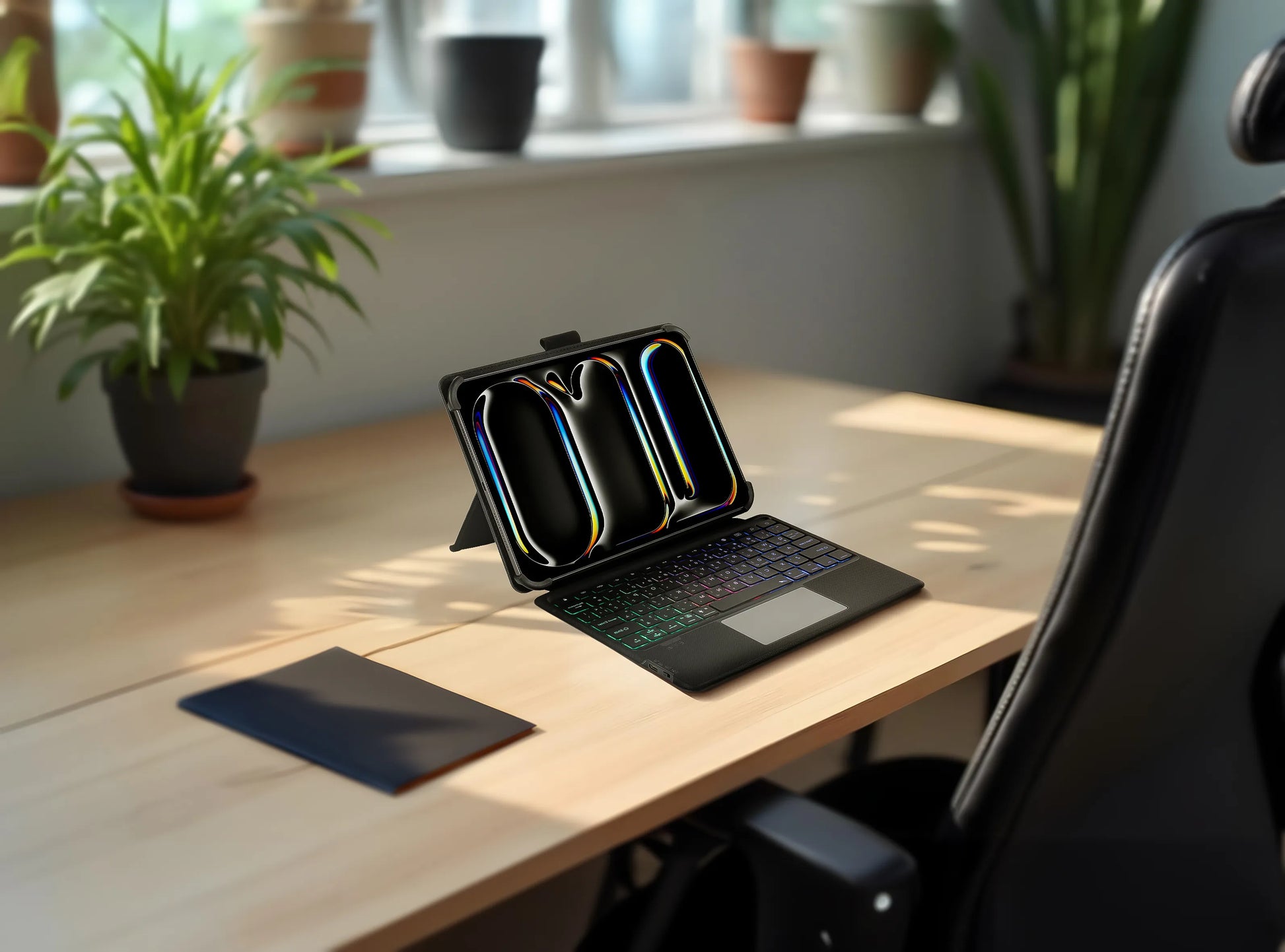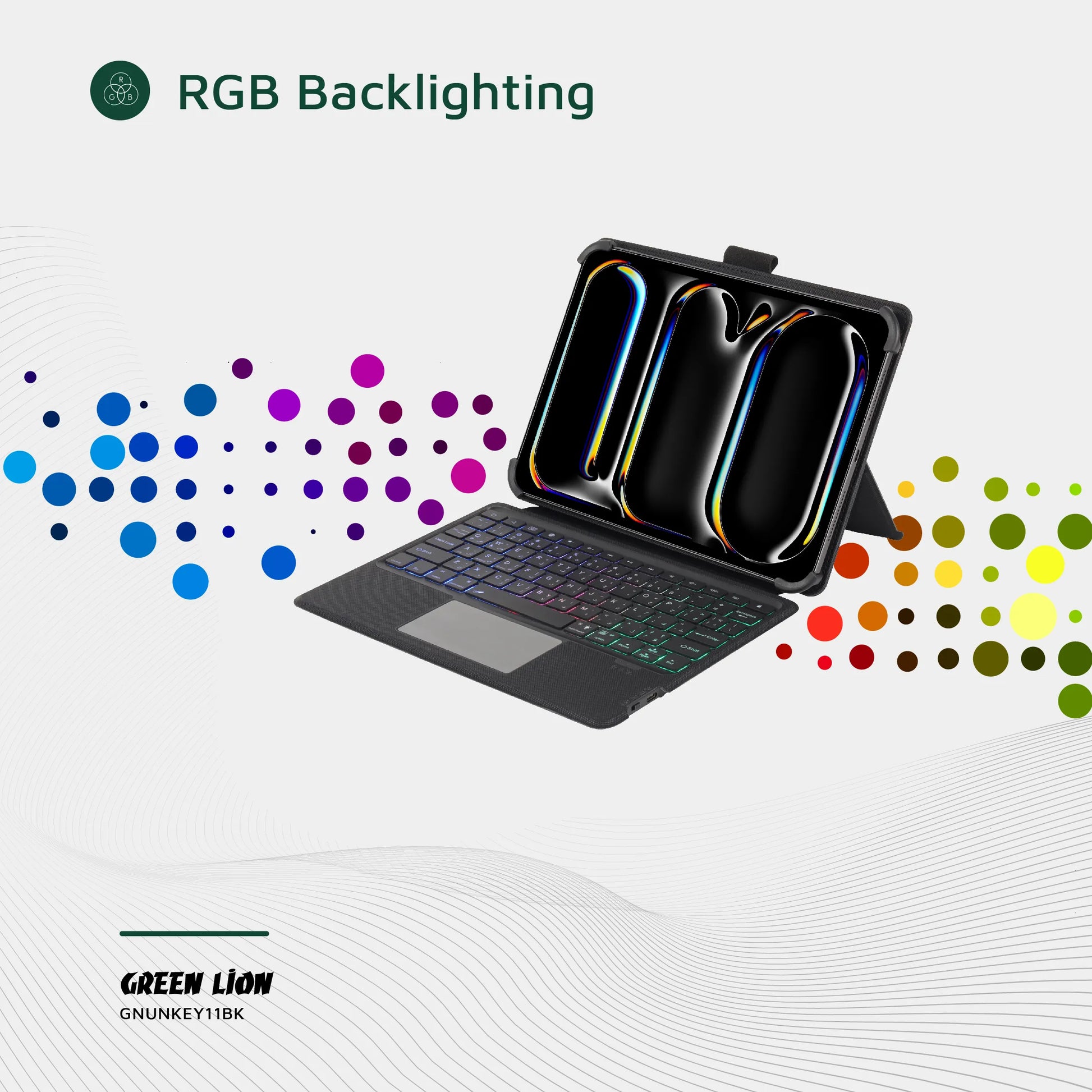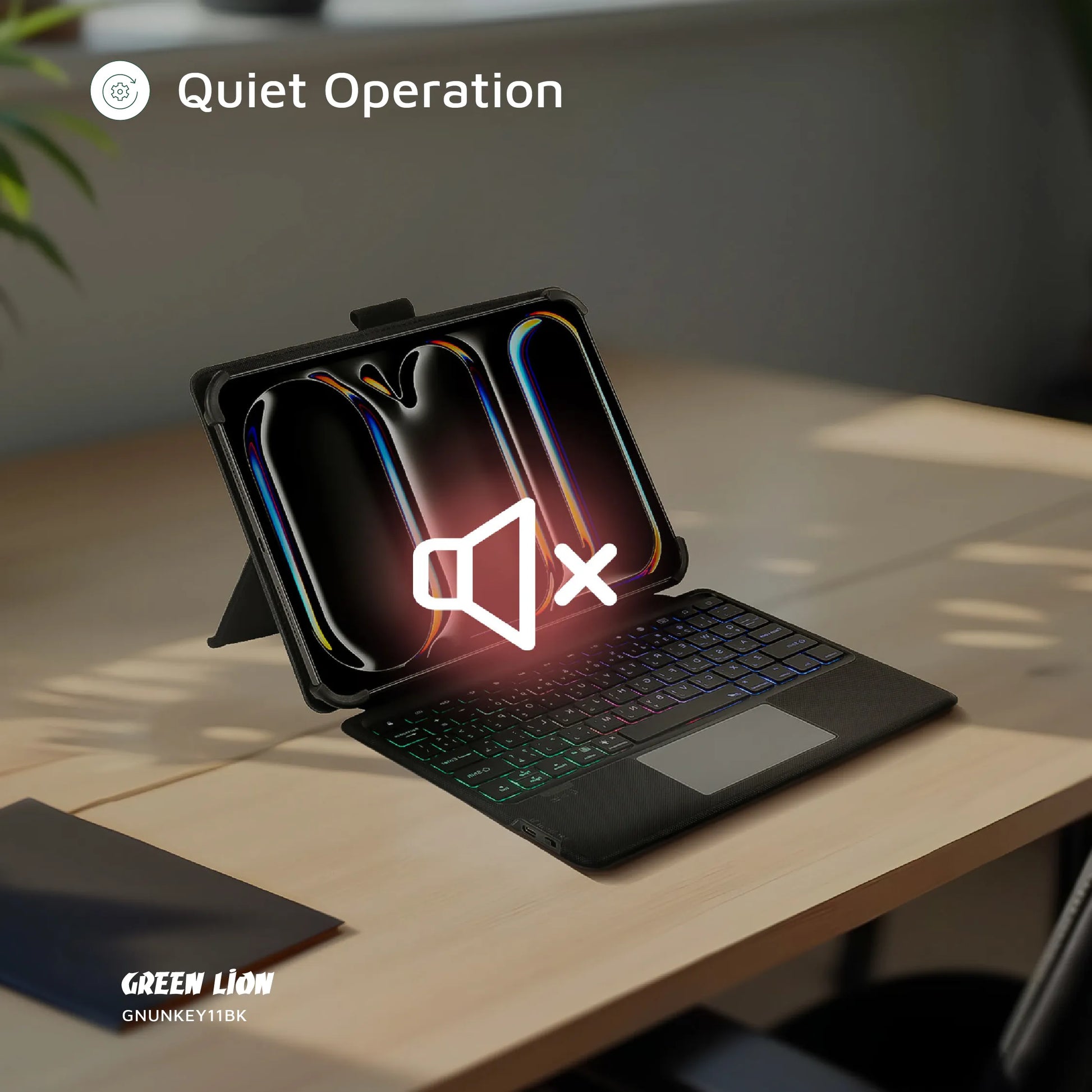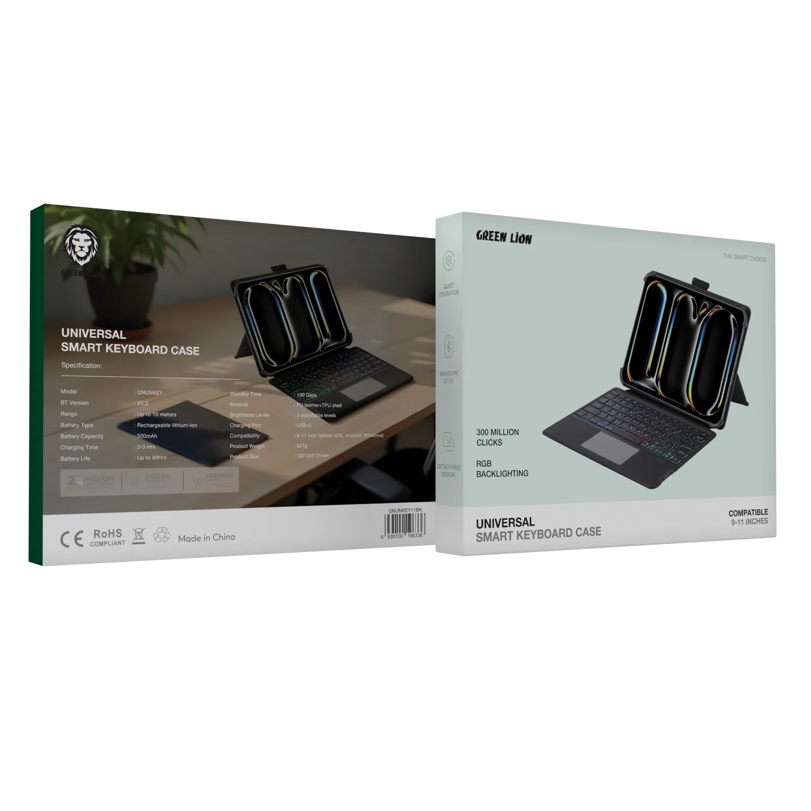 حافظة لوحة المفاتيح الذكية العالمية من Green Lion رائعة وأنيقة للأجهزة اللوحية بمقاس 9-11 بوصة؛ فهي متوافقة تمامًا مع أنظمة iOS وAndroid وWindows، وتتصل عبر بلوتوث 5.0 لضمان ثبات الاتصال في نطاق يصل إلى 10 أمتار. تتميز بطاريتها الليثيوم أيون القابلة لإعادة الشحن بسعة 500 مللي أمبير/ساعة، وتدوم حتى 80 ساعة بشحنة كاملة، مع إمكانية الشحن السريع خلال ساعتين إلى ثلاث ساعات عبر منفذ Type-C. يوفر جلد البولي يوريثان المتين وغطاء TPU الحماية والأناقة. تتيح لك المفاتيح الهادئة تجربة كتابة سلسة دون تشتيت، بينما يضمن عمر الطباعة الذي يصل إلى 300 مليون نقرة أداءً يدوم طويلًا. تصميمها القابل للفصل وإضاءة RGB الخلفية يجعلها جهازًا عصريًا ومناسبًا للاستخدام في ظروف الإضاءة الخافتة: تجمع حافظة لوحة المفاتيح هذه بين العملية والأناقة في جهاز واحد للعمل والترفيه.