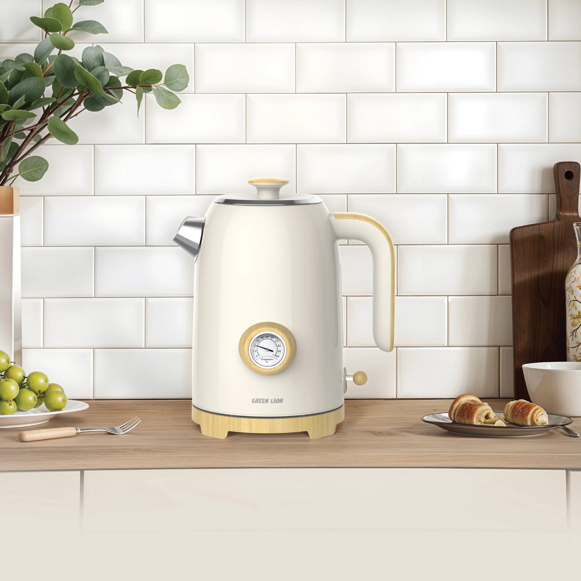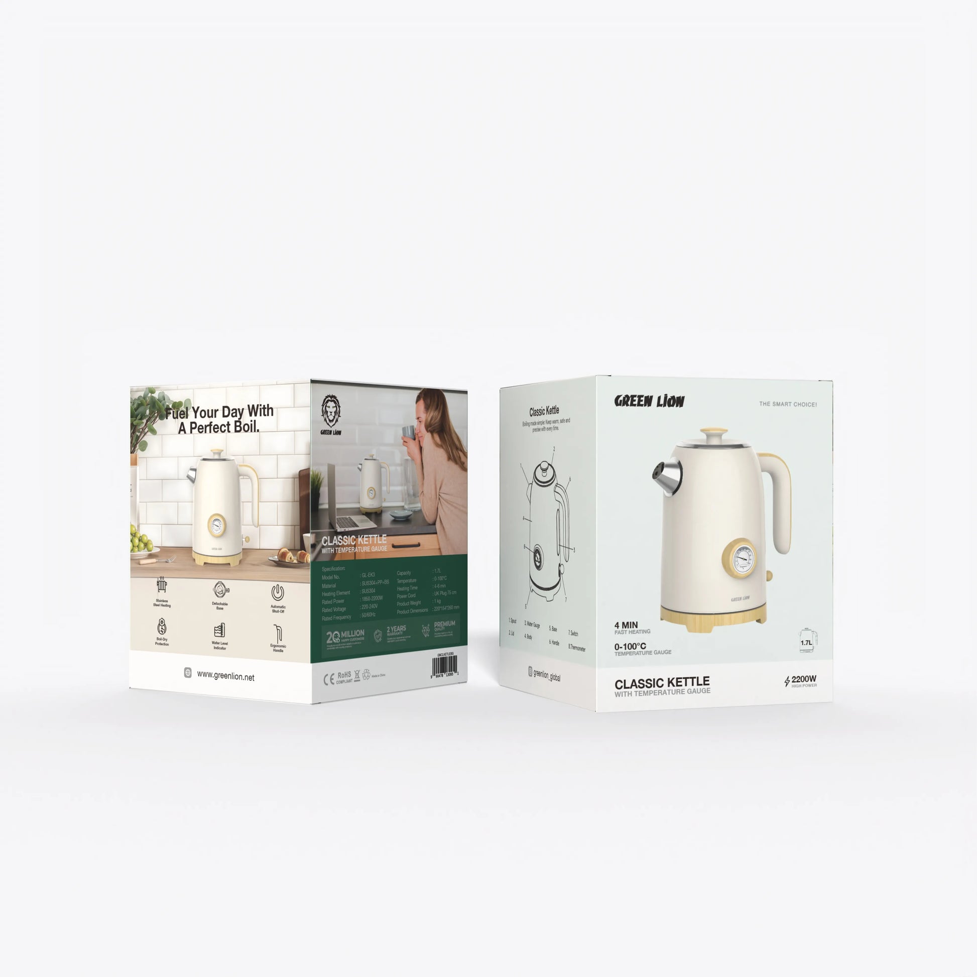 Green Lion Classic Kettle is a quick-acting kitchen essential that can quickly and effectively boil water. Its body consists of SUS304 stainless steel, PP plastic, and BS material, with its 1.7L having a high-power SUS304 element with 2200W power. This serves to quickly heat and boil the water within a time frame of 4-6 minutes. It features 0-100°C temperature control for precise control for all your hot beverage needs. The kettle additionally features boil-dry protection, automatic switch-off, and a detachable base for convenience. There is an ergonomic handle for comfortable grip and a water level indicator for easy monitoring of the water quantity. With a UK plug and a 75 cm power cord, the kettle enables safe and efficient operation, making the Green Lion Classic Kettle perfect to operate in any domestic or office setting.