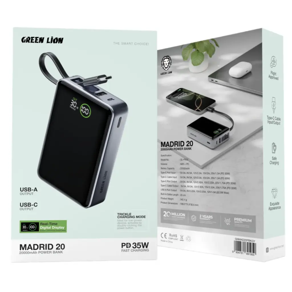 Green Lion Madrid 20 Power Bank has a large 20000mAh battery capacity, constructed with tough ABS and PC materials for extended durability. It features fast charging via Power Delivery (PD) 35W with Type-C cable and port, supplying various voltage outputs to rapidly and safely charge multiple devices. The built-in 20 cm Type-C cable makes it convenient to charge without needing extra accessories, while the USB-A port has a 22.5W output to accommodate wide device compatibility. It is a travel power bank that is flight-approved, meaning you can carry it with you wherever you travel. The sleek and sophisticated design equals its safe charging technology for safe and efficient power wherever you need it.